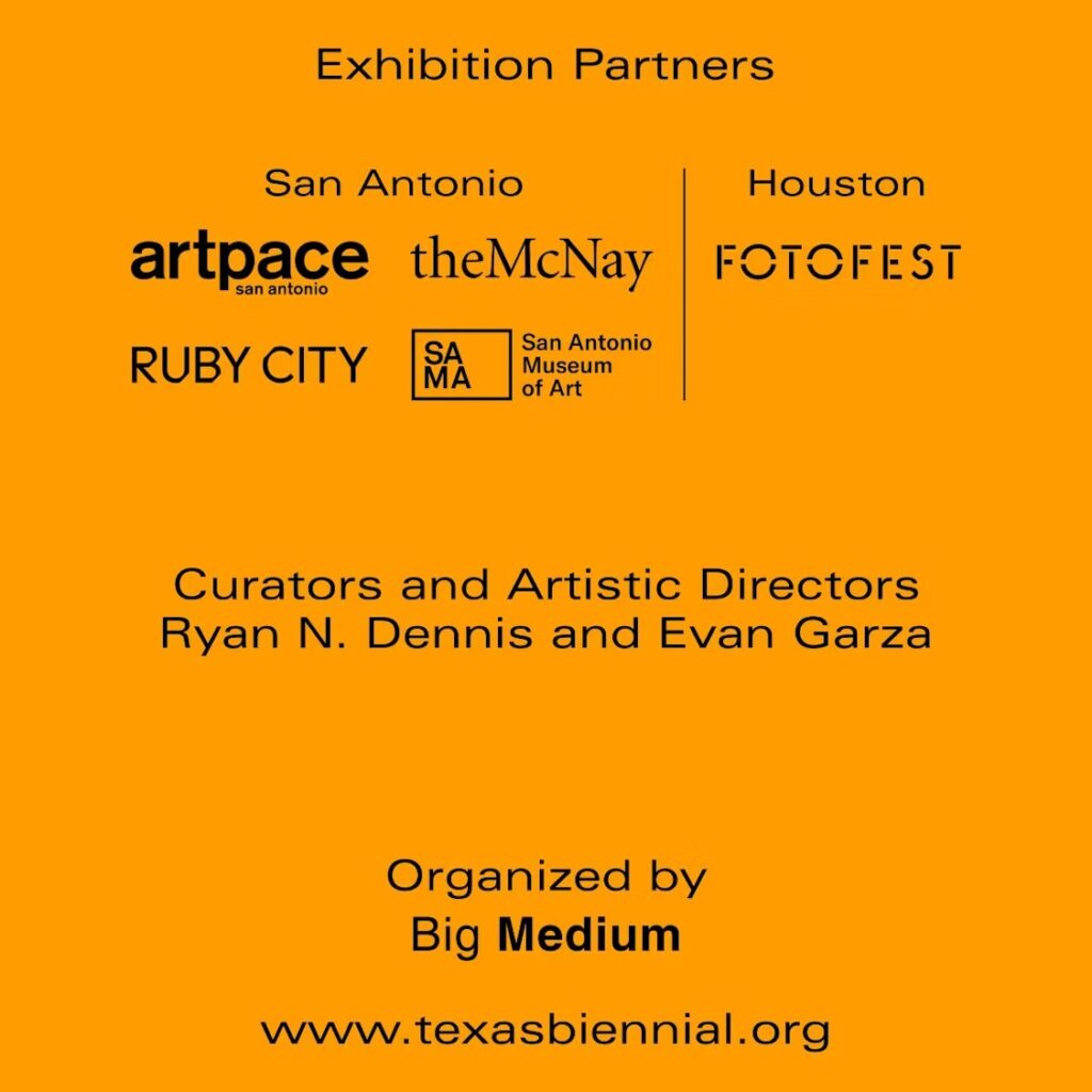 Artists featured in the 2021 Texas Biennial range from emerging artists and collectives to well‑established and internationally celebrated artists working in sculpture, film and experimental video, photo-based media, installation, sound, painting, printmaking, music and performance, social practice, and public art. The curators selected artists from more than 850 considerations over the last 18 months. Both Garza and Dennis performed hundreds of studio visits—in person before the pandemic and exclusively through virtual means since March 2020. Shortly after their appointment to curate the Texas Biennial, both Dennis and Garza moved with their respective partners and families out of Texas—Dennis to Jackson, Mississippi, and Garza to Washington, D.C.—immediately followed by the coronavirus pandemic and a year in lockdown. Separated from each other, their Big Medium team in Texas, and artists across the country by thousands of miles, Dennis and Garza organized the 2021 Texas Biennial via Zoom, FaceTime, email, phone, and text with the aid of curatorial and production assistant, Rigoberto Luna, in San Antonio and the support of Coka Treviño, Shea Little, and Big Medium in Austin.