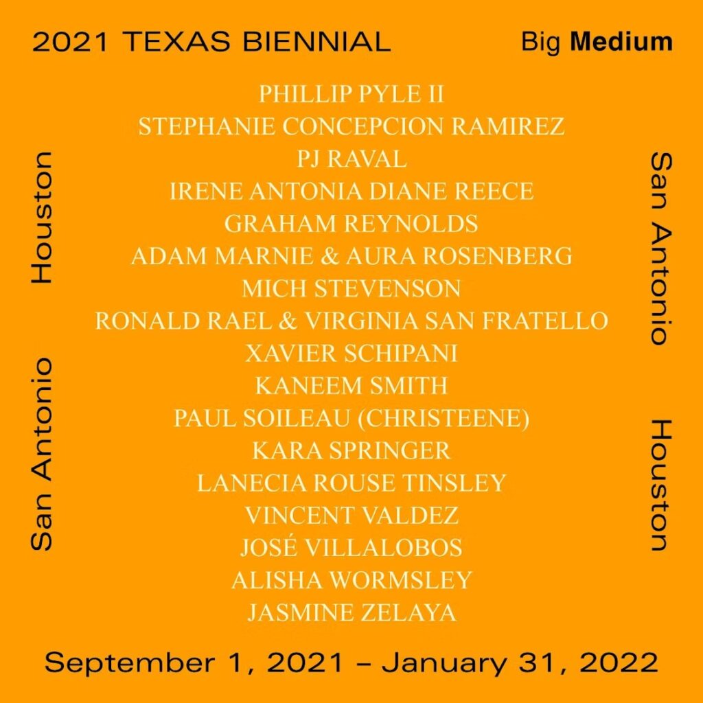 In addition to artists living and working in Texas, the Biennial curators have broadened the scope of the project to include “Texpats,” i.e. Texas natives and artists with deep connections to the Lone Star State working in any part of the world. In another first, the 2021 Texas Biennial will also feature international artists for whom Texas and its history are subject matter.